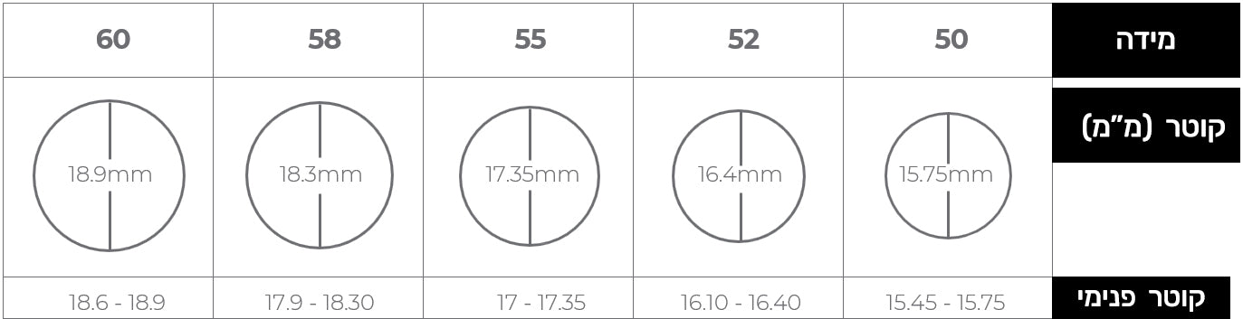 המדידה מציינת את קוטר הטבעת. כדי לדעת מהי המידה המתאימה לך, מדדי עם סרגל קוטר של טבעת שברשותך (יש למדוד את החלק הפנימי בלבד, ללא חישובו של הרינג כלומר החלק המתכתי של הטבעת)